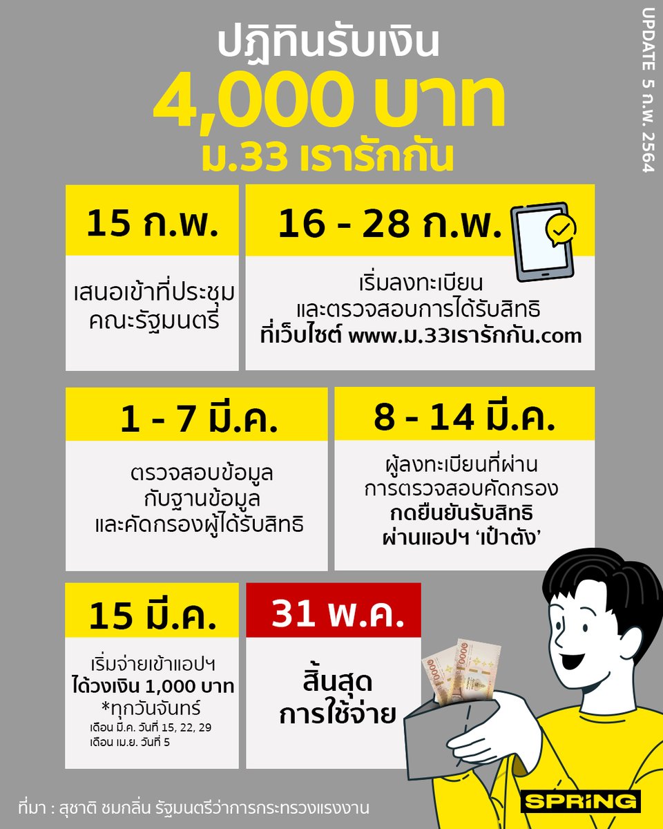 Source: s.isanook.com สุชาติ ชมกลิ่น รมว.แรงงาน เผยเกณฑ์จ่ายเงินเยียวยา ม.33 เรารักกัน จำนวน 4,000 บาท หากผ่าน ครม.15 ก.พ.นี้ คาดเปิดลงทะเบียนผ่านทาง www.ม.33 เรารักกัน.com วันที่ 16.